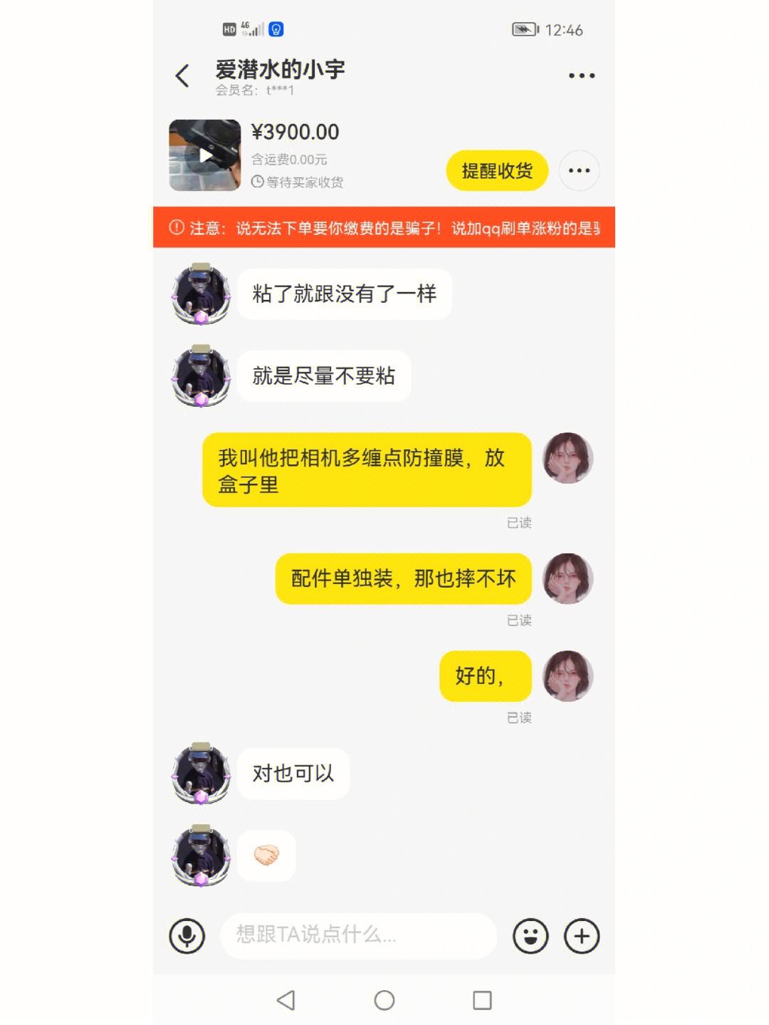 刘先生:闲鱼的客服说这种案例其实还算比较常见的,他们不能接受理赔,可能就给我500块钱,如果我不接受,我就去走法律程序,我说法律程序是啥?他说闲鱼看相机被秒拍你上法院去起诉它。我现在就有点动摇,最终我想要这个买家负责,但是现在他利用这种交易规则,可能谁也拿不出证据来。